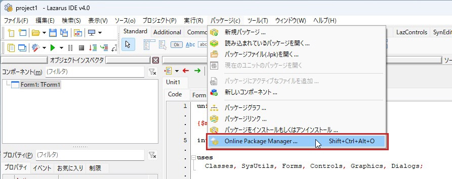 本ページの機能を実行するには、インターネットに接続し、「Lazarus パッケージインストール1」で「onlinepackagemanager」がインストールされている必要があります(Lazarus 4.xではインストールされています)。