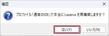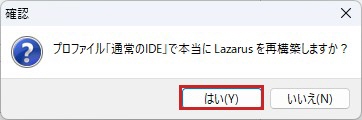 Lazarus IDE の再構築の確認メッセージが表示されます。