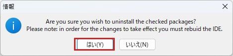 パッケージのコンパイルが完了すると、Lazarus IDEへの組み込み(再構築)の確認メッセージが出ます。