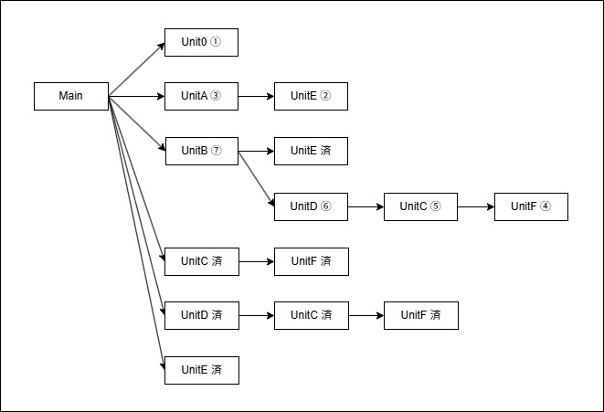 「Unit0」「UnitA」「UnitB」をたどると「Unit0」「UnitA」〜「UnitE」そして追加の「UnitF」の初期化順序@〜Eが確定することになります。